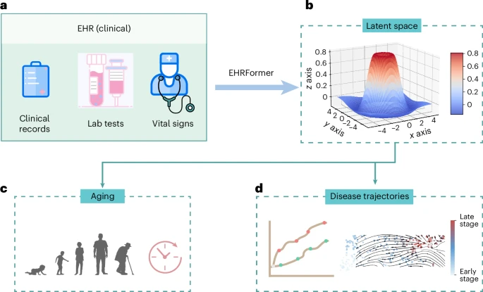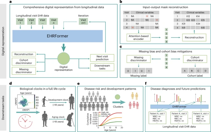 图3:使用 EHRFormer 架构对全生命周期生物钟进行建模的潜在空间方法。a, 模型将高维、纵向的电子健康记录数据作为输入,包括结构化的临床记录、实验室检测结果和生命体征。b, EHRFormer(一个基于 Transformer 的基础模型)处理这些数据,并将其投影到一个低维潜在空间中。这为个体随时间变化的健康状况创建了一个全面且稳健的”数字化表征”。随后,这个学习到的表征被用于两个关键的下游应用。c, 对人类全生命周期(从婴儿期和儿童期的发育到成年期及老年期的衰老)中的生物衰老进行建模。d, 预测个体疾病轨迹,实现风险分层,并识别具有不同临床路径的患者亚组。