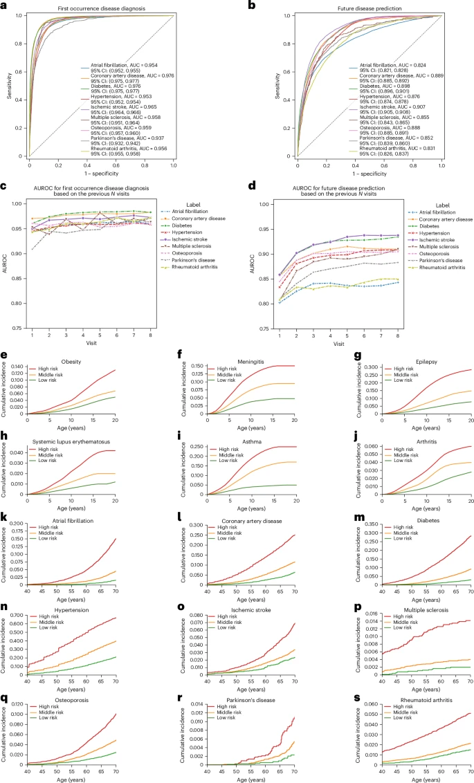 如图所示,在儿童期被AI划分为“高风险”组的个体,其在发育过程中患上肥胖、癫痫或哮喘的累积发病率,显著高于“低风险”组。同样,40岁时的常规数据也能清晰地分离出未来患上房颤、中风或帕金森病的高危人群。