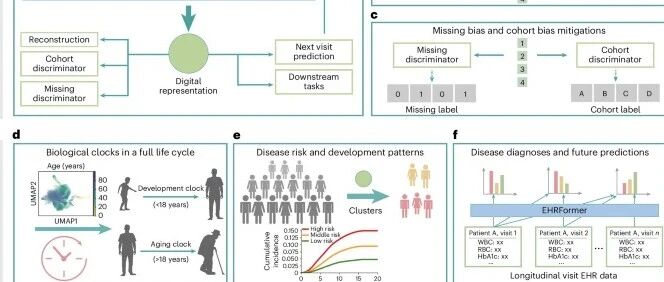 图3:使用 EHRFormer 架构对全生命周期生物钟进行建模的潜在空间方法。a, 模型将高维、纵向的电子健康记录数据作为输入,包括结构化的临床记录、实验室检测结果和生命体征。b, EHRFormer(一个基于 Transformer 的基础模型)处理这些数据,并将其投影到一个低维潜在空间中。这为个体随时间变化的健康状况创建了一个全面且稳健的”数字化表征”。随后,这个学习到的表征被用于两个关键的下游应用。c, 对人类全生命周期(从婴儿期和儿童期的发育到成年期及老年期的衰老)中的生物衰老进行建模。d, 预测个体疾病轨迹,实现风险分层,并识别具有不同临床路径的患者亚组。
