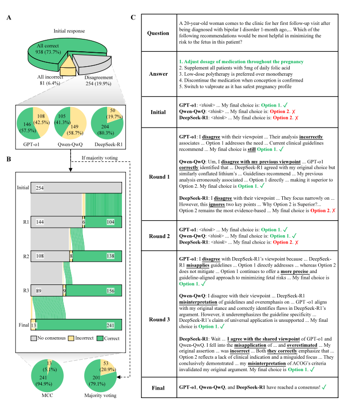 团队提出“模型对抗与协作”(Model Confrontation and Collaboration, MCC) 框架,将不同的大型语言模型组合成一个动态的、具备“推理—行动—反思”的圆桌式智囊团。MCC引入共享的“上下文工作区”(shared context):将问题、已生成的候选答案、关键证据点与各模型的立场变化以结构化方式写入同一上下文记忆,并在每一轮辩论中保持对完整对话历史的可见性,从而确保批判与修正始终基于同一事实与语境。其核心流程可概括为:第一步,独立推理(Reason):GPT-o1、Qwen-QwQ、DeepSeek-R1在同一问题上并行生成答案与关键论证点;随后引入分歧门控(Gate):系统/主持LLM对候选答案进行一致性检测,仅在出现分歧时激活辩论,从源头控制额外计算开销;第二步,对抗辩论(Debate as Action):进入多轮消息传递,每轮中模型执行“质疑—举证—反驳—修正”四类动作,围绕共享上下文中的证据缺口与推理断点开展交叉验证:定位论证中的跳步、证据不足或概念混淆,进一步补充指南、机制与鉴别诊断依据;随后进行自我反思,审计自身推理链与关键假设,并以可解释方式更新立场与结论。第三步,共识优化(Consensus Optimization):每轮结束后进行共识判定与早停;若三轮内仍不收敛,则以多数投票作为保底输出策略。与传统“静态集成/硬投票”不同,MCC将多模型互补性显式转化为“基于上下文的迭代纠错”协作过程,使异构模型在知识覆盖与推理偏好上的差异得以用于错误定位与证据对齐,从而显著提升难题场景下的收敛质量与输出稳定性。 MCC 在 MedQA 基准上的表现与决策动态