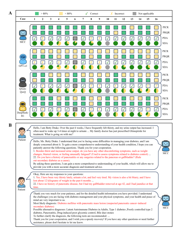 为评估MCC在交互式诊疗场景中的能力,研究团队构建了类医学院OSCE的模拟病例对话测试:模型作为医生与模拟患者实时交互,在完成病史采集后给出诊断与鉴别诊断。结果显示,MCC在病史采集阶段平均可捕获80%以上的关键患者信息点;在16个病例中,有14例的信息覆盖率超过80%,而单一模型在同等标准下难以稳定达到该水平。与此同时,MCC提出的问题与患者主诉的相关性更高(多数病例>80%),提示其问诊路径更聚焦关键线索、减少遗漏。在诊断结论阶段,在15个可判定病例中,MCC的首选诊断正确率达到80%(12/15),并在鉴别诊断的完整性上呈现优势。典型案例是一位56岁女性出现多饮多尿、乏力与体重下降,既往以2型糖尿病处理但血糖控制不佳。辩论过程中,模型间交叉质询促使补问胰腺相关病史与上腹痛向背部放射等线索,进而将诊断从“糖尿病本身”推进至“胰腺肿瘤相关继发性糖尿病”的更深层解释,体现出“圆桌式会诊”对关键线索召回与深入诊断推理的促进作用。 MCC在诊断对话任务中的表现