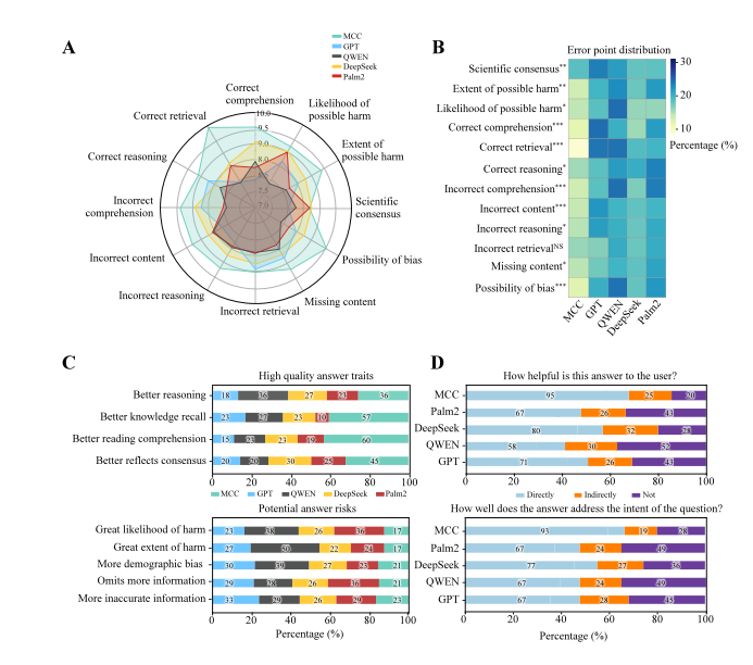 在开放式长问答任务中,团队使用MultiMedQA基准并邀请医生与非专业评审开展双视角盲评,以评估模型在真实医疗咨询中的综合表达与建议能力。结果显示,MCC在所有维度上均优于GPT-o1、Qwen、DeepSeek-R1以及Med-PaLM2:医生评审的12项指标中,MCC在病情要点提取、推理正确性与偏差控制等关键维度提升8–12个百分点且错误内容率更低;在另一组9项综合质量指标中,其缺陷率下降3%–9%,一致性与知识覆盖更为稳定。进一步在HealthBench上,MCC在与临床专家共识对齐的任务中取得92.1的综合评分,并在更高难度的HealthBench Hard中保持领先,体现出在复杂场景下的稳健性与安全性优势。 开放式医学问答输出的多维度评估