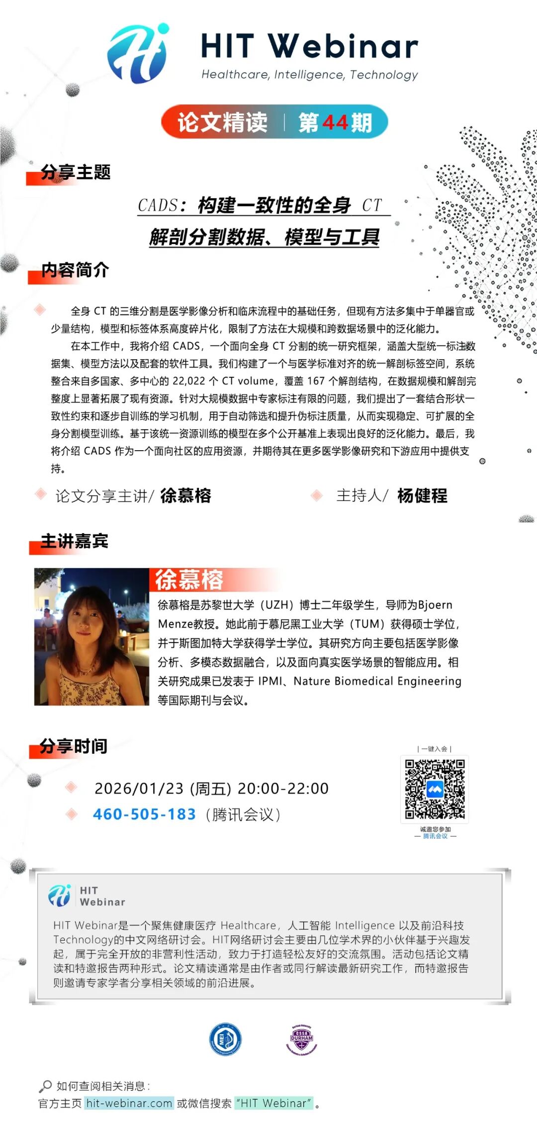 在本工作中,嘉宾将介绍CADS,一个面向全身CT分割的统一研究框架,涵盖大型统一标注数据集、模型方法以及配套的软件工具。团队构建了一个与医学标准对齐的统一解剖标签空间,系统整合来自多国家、多中心的22,022个CT volume,覆盖167个解剖结构,在数据规模和解剖完整度上显著拓展了现有资源。针对大规模数据中专家标注有限的问题,团队提出了一套结合形状一致性约束和逐步自训练的学习机制,用于自动筛选和提升伪标注质量,从而实现稳定、可扩展的全身分割模型训练。基于该统一资源训练的模型在多个公开基准上表现出良好的泛化能力。最后,嘉宾将介绍CADS作为一个面向社区的应用资源,并期待其在更多医学影像研究和下游应用中提供支持。END