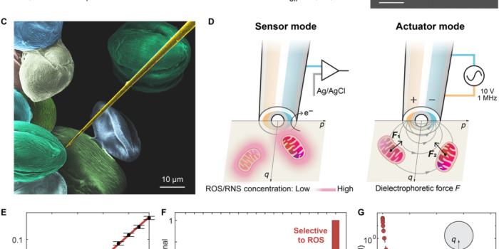 • 身份二:纳米级“介电镊子”。当检测到足够强的ROS/RNS信号(阈值 >8 pA),系统瞬间切换模式。在两个电极间施加高频交流电场,产生强大的介电泳力,将纳米探针尖端约1.8微米范围内的线粒体牢牢“吸住”,完成抓取与提取。
