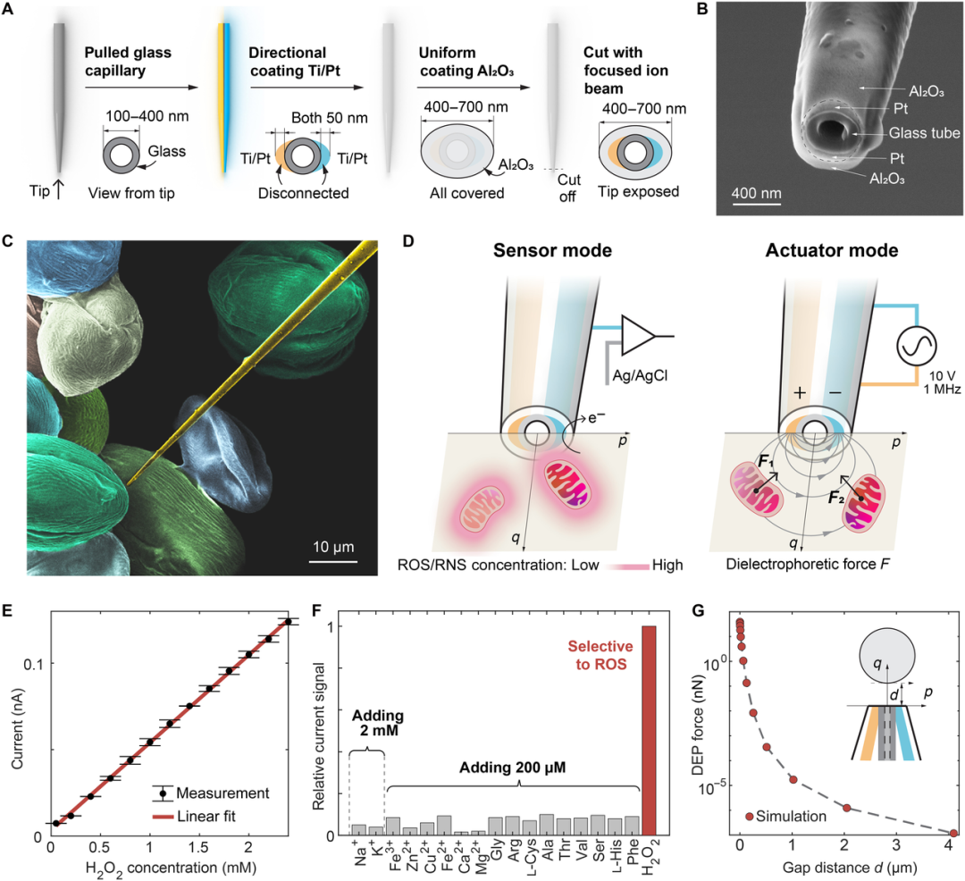 1. 基础性能验证:探针对过氧化氢(一种ROS)的检测呈线性响应,选择性高,且性能稳定。模拟与实验均证实,其产生的介电泳力足以在纳米级范围内捕获目标。