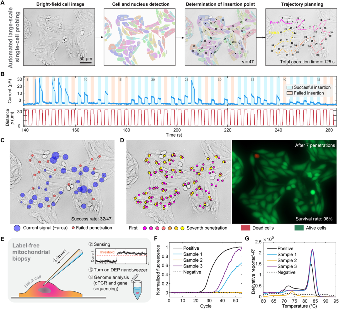 3. 规模化、自动化操作演示:在一个包含47个细胞的密集区域内,系统在125秒内完成了对所有细胞的自动化穿刺与传感探测,成功率约68%。失败主要发生在未完全贴壁的圆形细胞上。全程数据被完整记录,这在细胞研究中是罕见的,极大增强了实验的可追溯性和可重复性。
