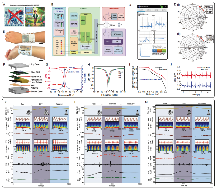 上图展示了该腕带式设备的柔性传感器集成、无线电力传输(NFC)以及多模态传感架构,用于获取同步的生理和分子数据。