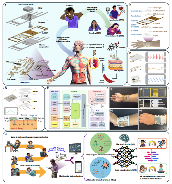 压力是影响心理和生理健康的全人类共同体验。然而,长期以来,压力监测往往依赖于主观问卷或单一的物理指标(如心率),缺乏一种能够同时结合生理和分子生物标志物的客观、定量的长期监测工具。近期,来自加州大学欧文分校(University of California, Irvine)的 Rahim Esfandyarpour 团队在 Nature Communications 上发表了题为 “A quantitative, multimodal wearable bioelectronic device for comprehensive stress assessment and sub-classification” 的研究论文。该研究推出了一款名为 SQC-SAS 的可穿戴腕带设备,通过集成多种传感器和机器学习算法,实现了对压力的全面定量评估与状态亚分类(Sub-classification)。
