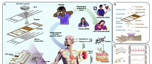 压力是影响心理和生理健康的全人类共同体验。然而,长期以来,压力监测往往依赖于主观问卷或单一的物理指标(如心率),缺乏一种能够同时结合生理和分子生物标志物的客观、定量的长期监测工具。近期,来自加州大学欧文分校(University of California, Irvine)的 Rahim Esfandyarpour 团队在 Nature Communications 上发表了题为 “A quantitative, multimodal wearable bioelectronic device for comprehensive stress assessment and sub-classification” 的研究论文。该研究推出了一款名为 SQC-SAS 的可穿戴腕带设备,通过集成多种传感器和机器学习算法,实现了对压力的全面定量评估与状态亚分类(Sub-classification)。