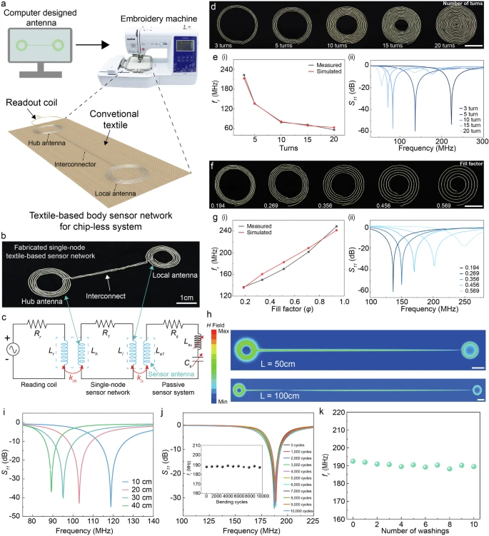 图2:单节点 tBSN 的电磁与机械特性表征。a 用于制备织物基体感器网络的数字刺绣工艺示意图。通过可编程刺绣机将计算机设计的天线图案刺绣至常规纺织品上。b 数字刺绣于织物基底上的单节点传感器网络照片,由枢纽天线、互连导线及本地天线构成。c 体感器网络与外部读取线圈及无源传感器耦合的集总元件电路模型。无源传感器可为容性和/或感性,响应外部刺激时会改变网络的谐振频率。d 不同匝数(3、5、10、15、20 匝)的织物基天线线圈照片,固定外径为 42 mm,匝间距为 0.5 mm。比例尺:2 cm。e 不同匝数天线线圈的电磁性能:(i)实测与仿真的谐振频率随匝数变化曲线;(ii)相应线圈的 S₁₁ 频谱。f 展示不同填充因子(从左至右:0.194、0.269、0.356、0.456、0.569)的织物基天线线圈照片,固定外径为 42 mm,匝数为 5。比例尺:2 cm。g 不同填充因子天线线圈的电磁性能:(i)实测与仿真的谐振频率随填充因子变化曲线;(ii)对应的 S₁₁ 频谱。h 互连长度分别为 50 cm 和 100 cm 的单节点传感器网络的磁场强度 |H| 仿真分布图。比例尺:3 cm。i 互连长度分别为 10、20、30、40 cm 的单节点传感器网络的实测 S₁₁ 频谱。j 织物基传感器网络在弯曲半径为 4.5 mm 条件下经历最多 10,000 次弯曲变形循环时的 S₁₁ 频谱。插图:织物基传感器网络在最多 10,000 次重复循环变形期间谐振频率的变化。k 织物基传感器网络在最多 10 次重复洗涤循环期间谐振频率的变化。