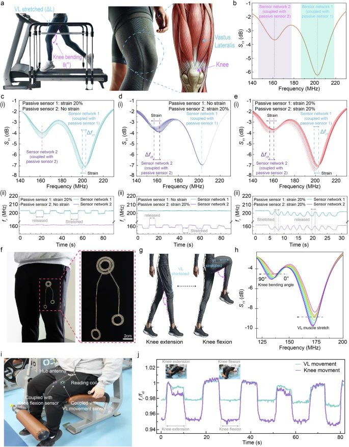 图4:通过集成 tBSN 的服装无线监测生物力学运动。a 描绘股外侧肌在膝关节运动与步态康复中作用的示意图。b 耦合了两个无芯片无源应变传感器的 tBSN 系统的实测 S₁₁ 频谱,显示出分别对应两个传感器的清晰谐振峰。c–e 当一个或两个传感器受应变时,通过 tBSN 对传感器响应进行的无线监测。(i)S₁₁ 频谱显示三种条件下的频率偏移(从左至右):应变施加于传感器网络 1 的无源传感器、传感器网络 2 的无源传感器,以及同时施加于两个网络。(ii)相同三种条件下谐振频率偏移的连续追踪,证实了对无源传感器独立且同步的监测,且串扰极低。f 集成 tBSN 的服装照片,其两个本地天线线圈分别位于 VL 与膝关节区域附近(未安装无源应变传感器)。g 展示 VL 肌肉动力学与膝关节运动之间生物力学关系的示意图。h 膝关节屈曲期间,VL 与膝关节区域同时受应变时,集成 tBSN 服装的 S₁₁ 频谱,显示出清晰且可区分的频率响应。i 展示使用集成 tBSN 服装实时监测腿部屈伸运动中 VL 与膝关节运动的实验设置照片。j 对应于重复膝关节屈伸循环的归一化谐振频率变化,显示出两个传感器节点的同步响应。