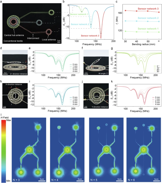 单节点网络在长达40厘米的互联导线距离下,仍能保持稳定无线传输,这足以覆盖身体主要关节距离。其谐振频率在10,000次剧烈弯曲和10次标准机洗后,偏移可忽略不计。