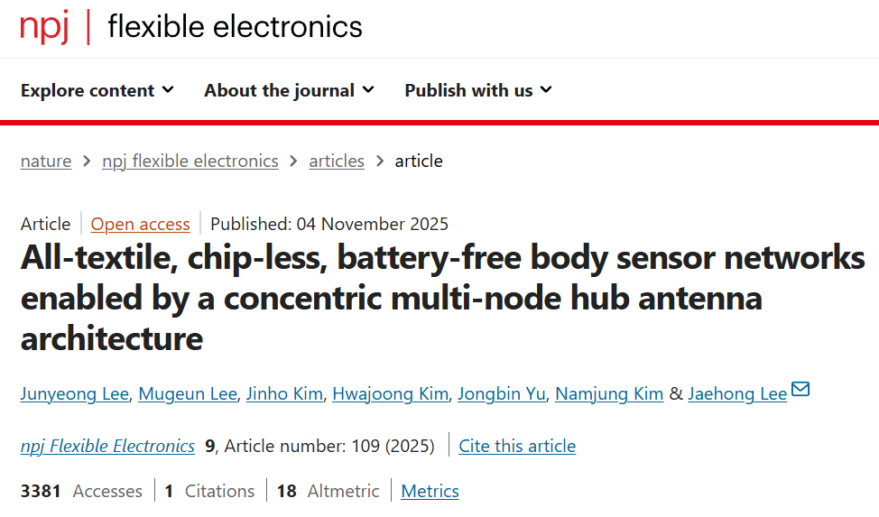 Lee, J., Lee, M., Kim, J. et al. All-textile, chip-less, battery-free body sensor networks enabled by a concentric multi-node hub antenna architecture. npj Flex Electron 9, 109 (2025).