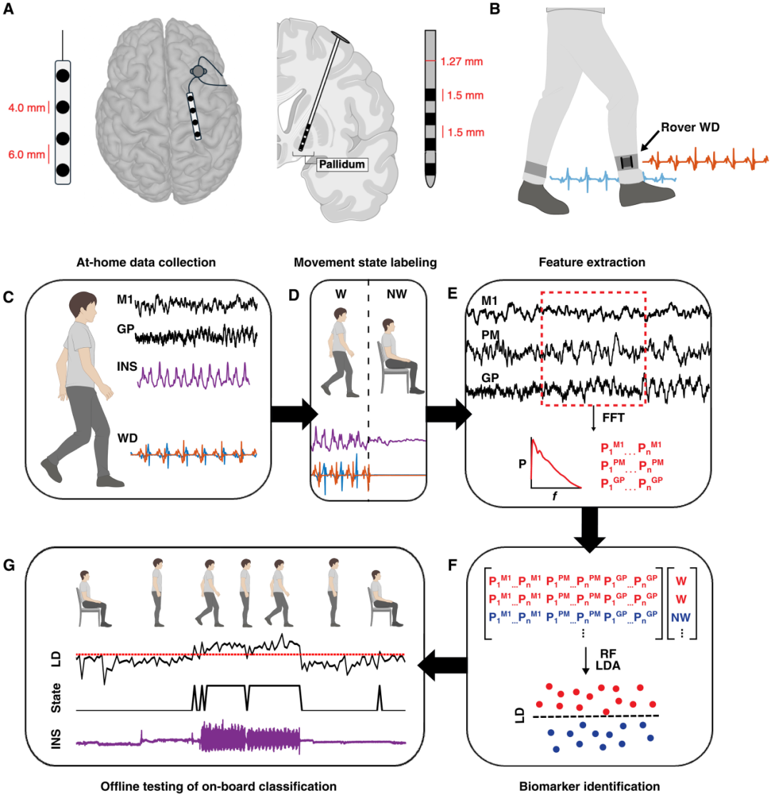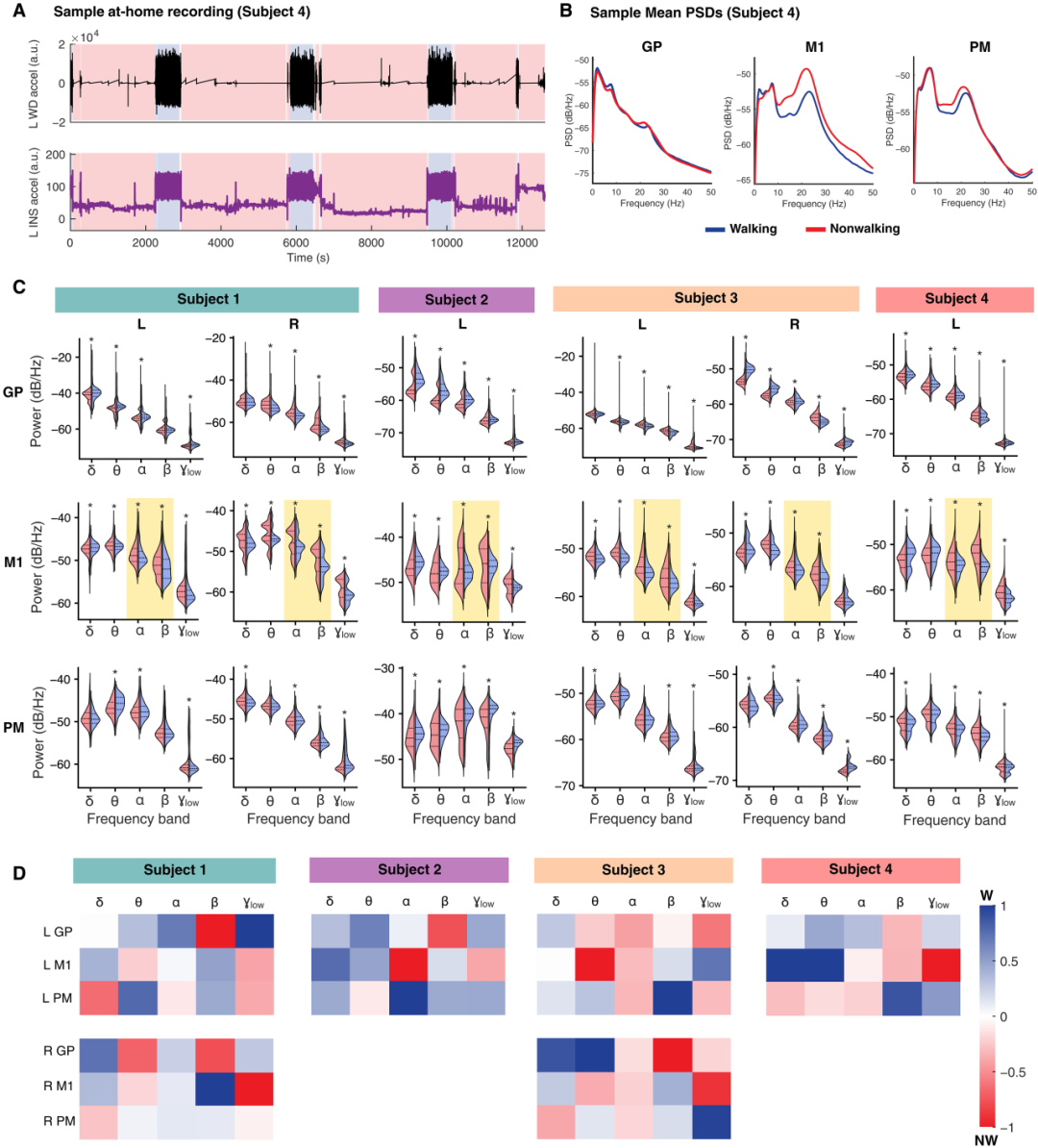 “同步记录”的居家实验室:研究团队让4位植入Summit RC+S(一种具备感知功能的实验性DBS设备)的帕金森病患者,在居家生活中同时佩戴踝部运动传感器。通过在超过80小时的无监督活动中,将大脑(运动皮层M1/PM、苍白球GP)的场电位信号与身体(双脚)的运动学数据精确同步,他们首次捕捉到了真实行走时的大脑活动快照。