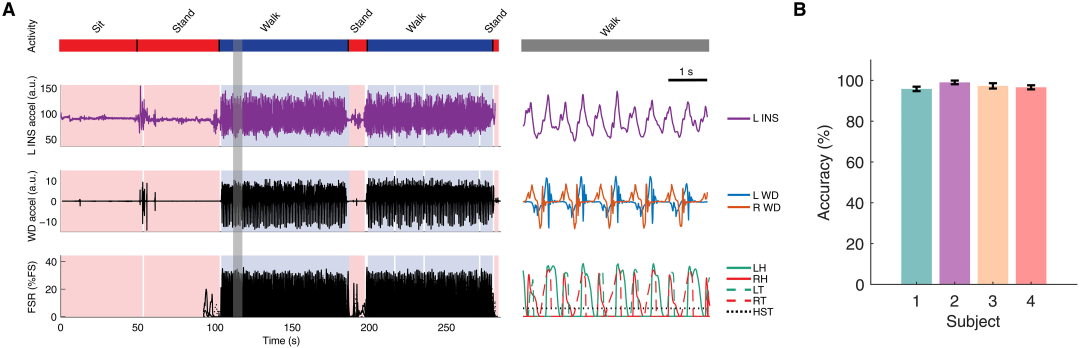 图 3. 可穿戴设备(WD)标记行走与非行走时段准确性的验证。(A) 在一次时长 300 秒、包含地面行走并穿插站立或静坐休息时段的实验过程中,展示了来自左侧 INS 和双侧可穿戴设备(WD)的加速度信号,这些信号与受试者足部力敏电阻器(FSR)的力信号对齐显示。顶部的颜色条指示了整个过程中受试者的行为(蓝色,行走;红色,非行走)。灰色方框标出的一个 5 秒连续行走时段已在右侧子面板中放大显示。(B) 展示了针对特定受试者的、基于可穿戴设备(WD)的运动状态标记的平均准确率(图 S2B)。误差线代表标准差。a.u.,任意单位;FS,力信号;HST,足跟触地阈值;LH,左脚跟;LT,左足趾;RH,右脚跟;RT,右足趾。