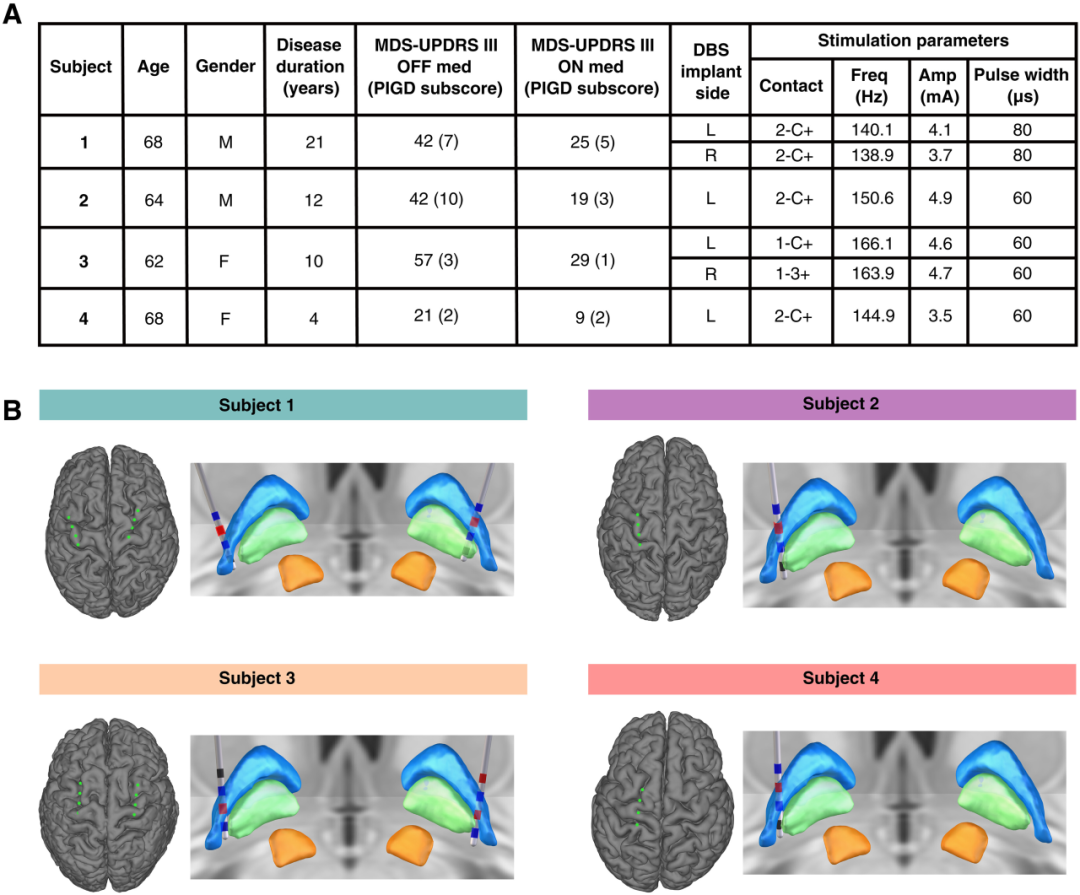 (A) Summit RC+S 双向神经刺激器的皮质电极(覆盖于 M₁ 和 PM 上方,左图)和植入苍白球(GP)的皮质下深度电极(右图)示意图。