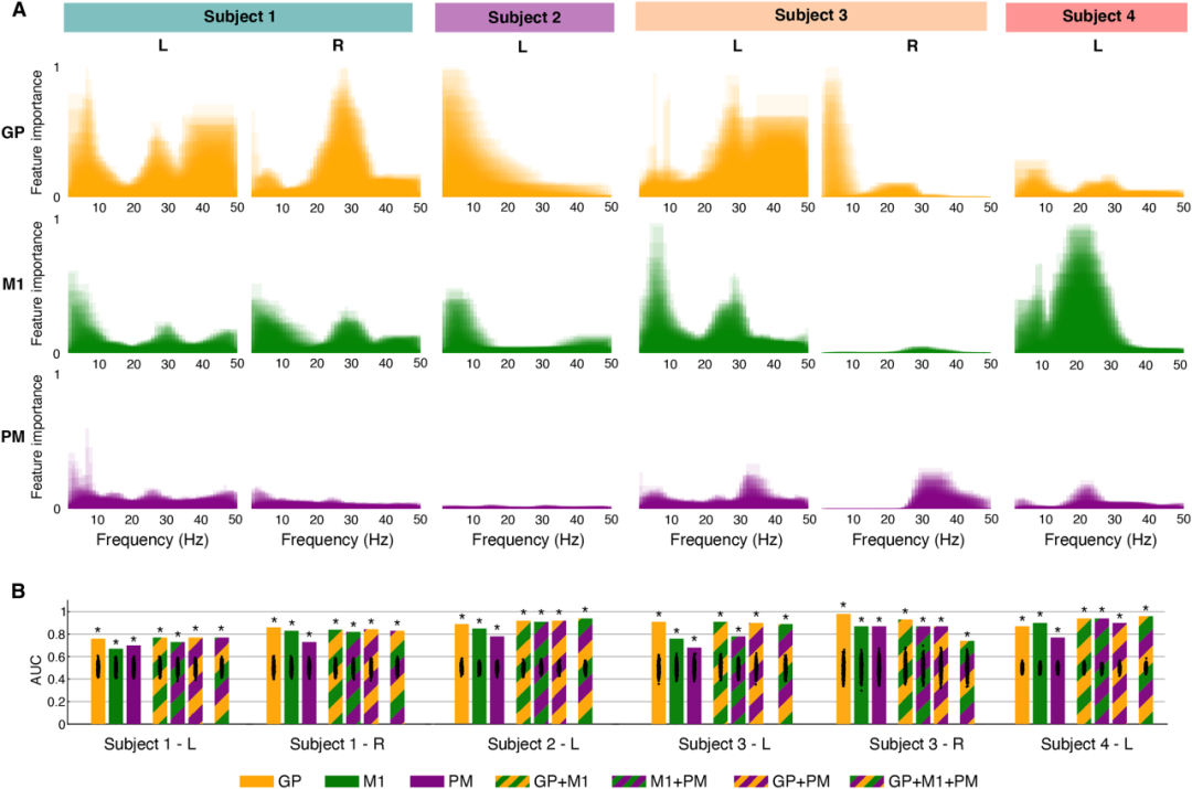 图 5. 受试者特异性运动生物标志物的识别。(A)展示了基于 1000 次随机森林(RF)迭代的基尼不纯度平均下降(MDI)所得到的、所有皮质-苍白球频带的归一化特征重要性。(B)展示了每个半球及每种模型类型(单区域、多区域和全区域)的线性判别分析(LDA)运动状态分类器性能。黑点表示经过置换得到的偶然水平性能(n=1000),这些用于计算单侧经验P值。