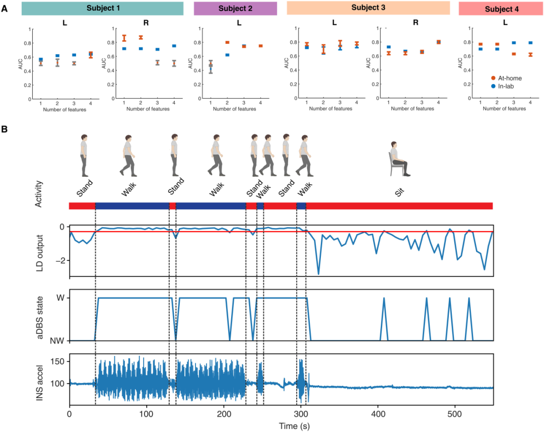 “芯片上的解码器”:最大的工程挑战在于,Summit RC+S芯片内置的线性判别分类器只能接受最多4个输入特征(且每个通道不超过2个)。这与动辄数十个特征的复杂模型相去甚远。团队将从居家数据中筛选出的最关键的1-4个窄带特征,输入到芯片的模拟环境中进行测试。结果表明,仅用3-4个特征,就能在芯片上实现AUC值最高达0.81的实时行走状态分类。