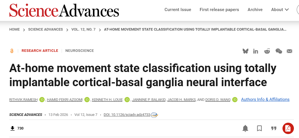 Rithvik Ramesh et al. ,At-home movement state classification using totally implantable cortical-basal ganglia neural interface.Sci. Adv.12,eadz4733(2026).DOI:10.1126/sciadv.adz4733