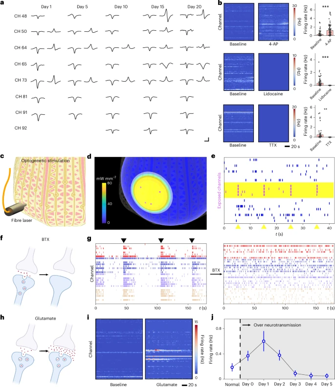 j,从集成的 3D 接口对 ( n = 96 ) 个独立通道进行的纵向监测显示,暴露于谷氨酸后 5 天内平均发放率先增加后减少。数据在 b 和 j 中以平均值 ± 平均标准误表示。