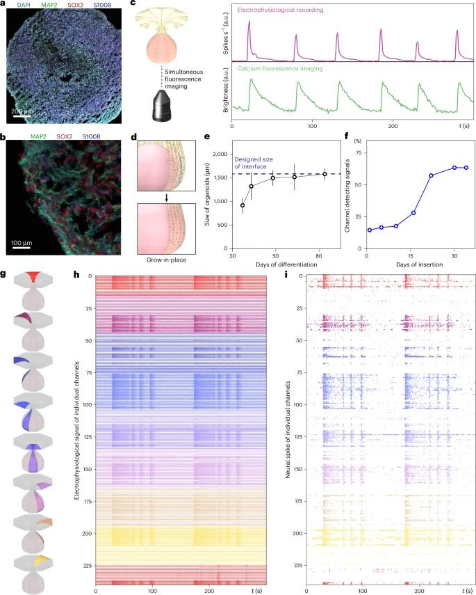 e,在此框架内培养的类器官的示意图和图像(插图),带有用于神经记录和刺激的外部连接电路。