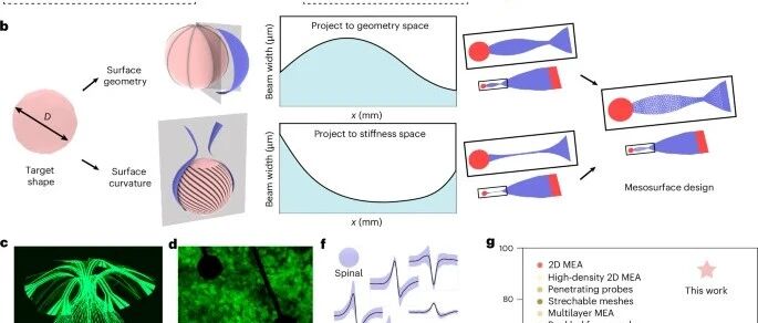 a,代表性系统的示意图。在逆向计算建模的引导下,对具有微格点几何结构的二维前体施加工程化机械屈曲方法,可形成所需的三维形状。微格点提供大面积以支持高密度微电极阵列,同时具有足够的孔隙率,允许自然代谢过程所需的扩散传输。