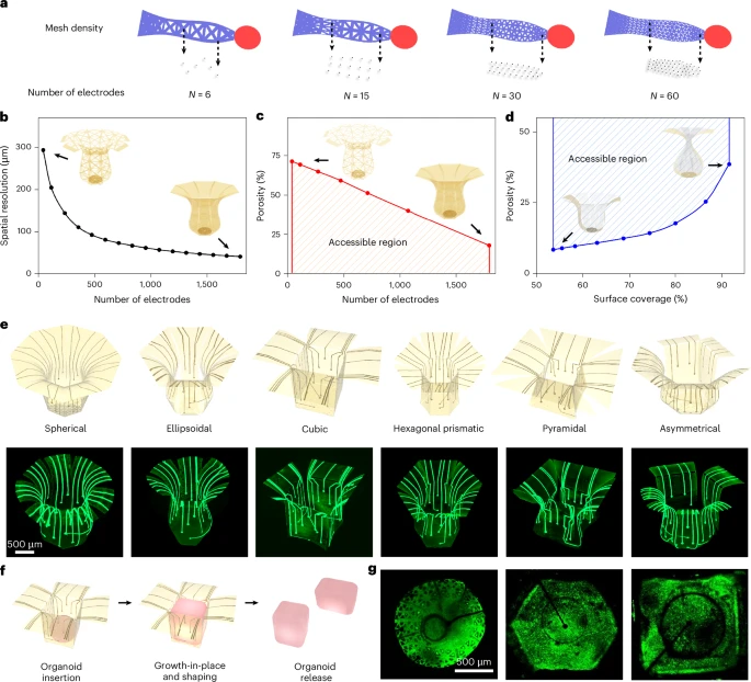 这项研究的突破性在于,它并非简单地将电子元件贴在类器官表面,而是通过一套精密的“逆向设计”与“自组装”流程,让电极阵列主动去适应、包裹、甚至塑造类器官的形态。