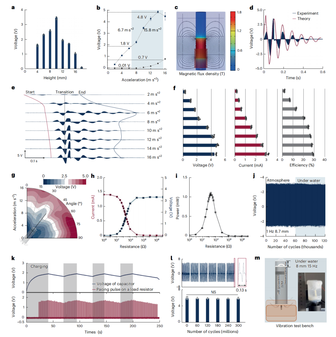 这一 RMS 功率(120㎼)是一个极具震撼力的指标。此前,基于摩擦纳米发电机(TENG)或压电材料(PENG)的自供电起搏器研究,其 RMS 功率通常在 1 – 50㎼之间摆动,且往往需要复杂的机械杠杆或较大的受力面积。STPM 仅靠电磁感应就在微型封装内达到了 120㎼,不仅满足了起搏(Pacing)的基本需求,还为未来的感知(Sensing)、无线通讯,甚至 AI 处理芯片预留了充足的“能量带宽”。