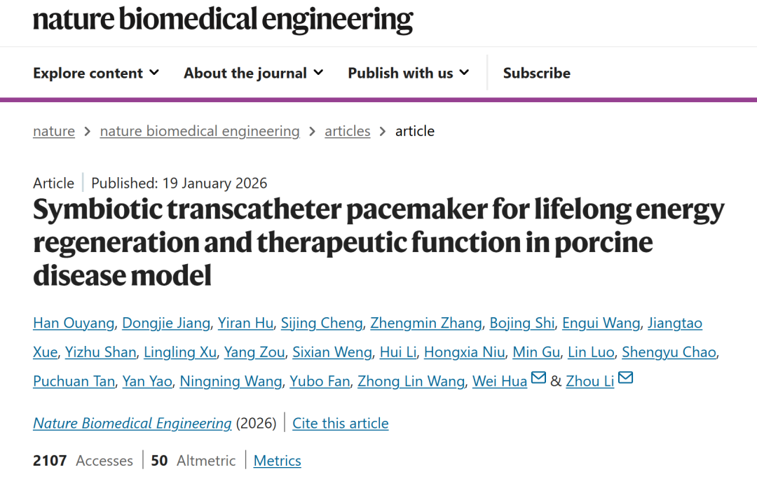 2026 年 1 月,由中国科学院北京纳米能源与系统研究所李舟研究员、王中林院士与阜外医院华伟教授团队共同研发的“共生经导管起搏器”(Symbiotic Transcatheter Pacemaker, STPM)在《自然·生物医学工程》(Nature Biomedical Engineering)正式亮相。这项研究提出了一种革命性的“能源共生”范式:通过在极其有限的体积内集成基于磁悬浮能量缓存结构的电磁感应发电机,STPM 能够将心脏跳动的机械能直接转化为电能,不仅满足了起搏器运行的“临界能量条件”,更在猪类大动物模型中实现了长达一个月的完全自主运行和心律失常治疗。这标志着心脏起搏器正从一个纯粹的“消耗性电子产品”转变为一个与人体生命节律深度融合、能源自给的“人造器官”。
