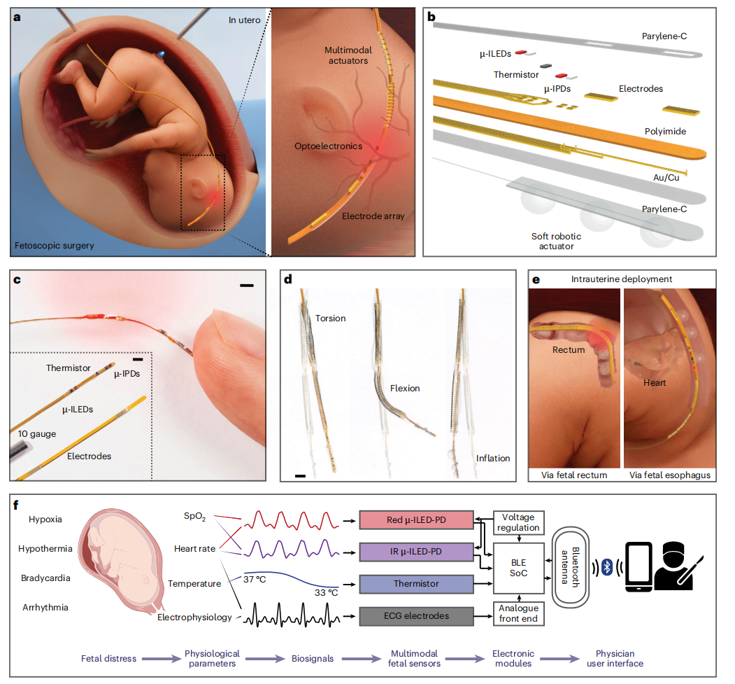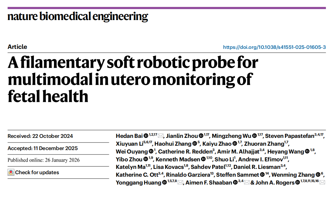为攻克这一难题,西北大学(Northwestern University)约翰·罗杰斯(John A. Rogers)教授领导的跨学科团队与芝加哥卢里儿童医院(Lurie Children’s Hospital)的艾门·沙班(Aimen F. Shaaban)博士近期在《自然-生物医学工程》(Nature Biomedical Engineering)上发表了一项里程碑式研究“A filamentary soft robotic probe for multimodal in utero monitoring of fetal health”(用于胎儿健康多模式宫内监测的丝状软体机器人探针)。该研究设计并开发了一种丝状软体机器人探针(SRFP),通过融合微型化生物电子传感技术与软体机器人驱动技术,首次将“ICU 级别的连续监护”引入子宫内部,为精准胎儿医学补上了缺失的实时反馈环路。