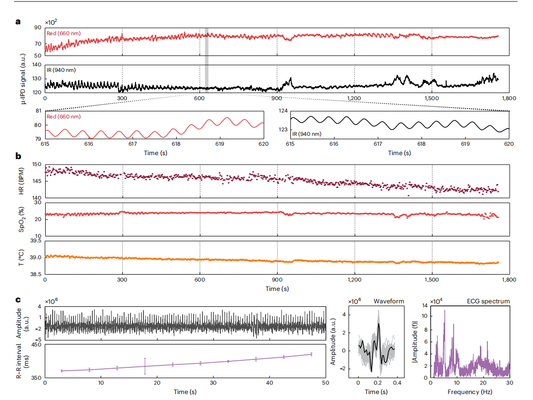 多模态传感平台(Multimodal Platform):在柔性基底上集成了光电、热敏和电生理传感器阵列,能够同步采集胎儿心率(FHR)、血氧(SpO2)、核心体温及高质量心电图(ECG)。