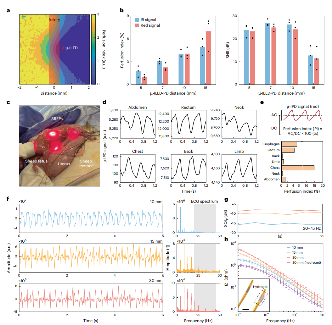 传感器的高保真度源于对光学与电生理特性的极致压榨。 研究团队通过蒙特卡罗模拟确定了红光/红外传感器 10 mm 的最佳间距,以在血氧灌注指数(PI)与信噪比(SNR)之间取得平衡。 在电生理方面,探针电极表面覆盖了定制的导电固体水凝胶,将电极-组织接触阻抗降低了约 60%。这种优化使得 SRFP 即使在复杂的电磁手术环境下,也能捕捉到辨识度极高的 QRS 波群,其信噪比显著优于传统的皮肤外贴片。