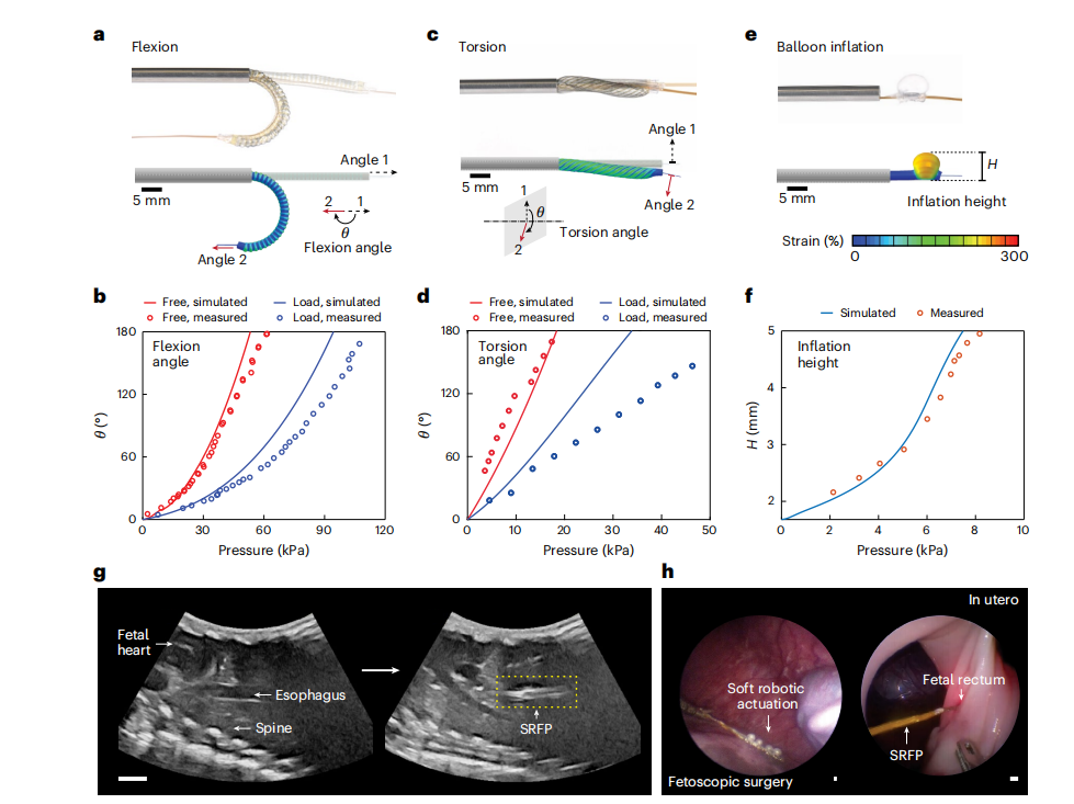 SRFP 的主动运动能力有一系列硬数据支撑。有限元分析(FEA)与实验结果高度一致:驱动器在低于 100 kPa 的安全压力下,即可实现180°的弯曲和180°的扭转。 在羊模型实验中,外科医生利用超声引导,将未驱动状态的探针送入胎儿食道,随后充压膨胀(约 7.4 kPa)。实验证明,这种“软性锚定”能够抵抗手术操作带来的物理位移,并在数小时内保持极低的运动伪影,确保了数据采集的连续性。
