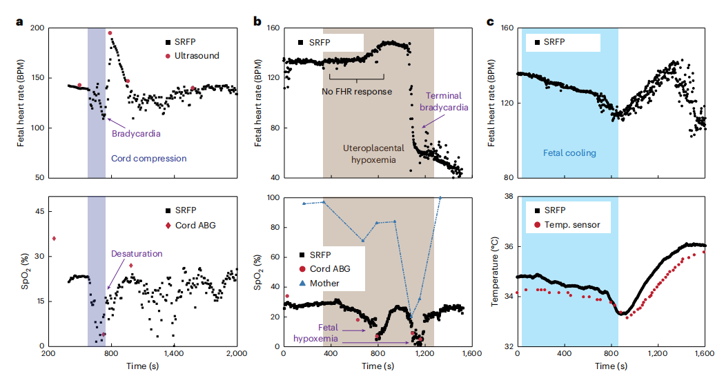在实际的羊胎儿镜脊柱裂修复术中,SRFP 展现出了临床级的性能。在长达 30 分钟的手术全程中,尽管外科医生对胎儿进行了频繁的移动,探针依然实时输出了准确的心率和血氧曲线。 校准后的胎儿血氧维持在正常的 23%(胎儿生理性低氧),核心体温保持在 39℃。这种类似于现代麻醉监护仪的实时流式界面,为胎儿镜手术提供了前所未有的心理安全垫。