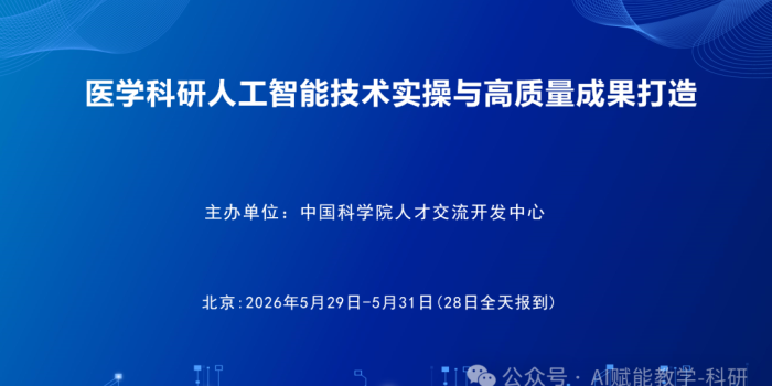 为精准对接国家医工交叉战略趋势,助力医学领域科研人员深度掌握人工智能技术,中国科学院人才交流开发中心将于2026年5月29日至31日在北京举办 “医学科研人工智能技术实操与高质量成果打造”高级研修班