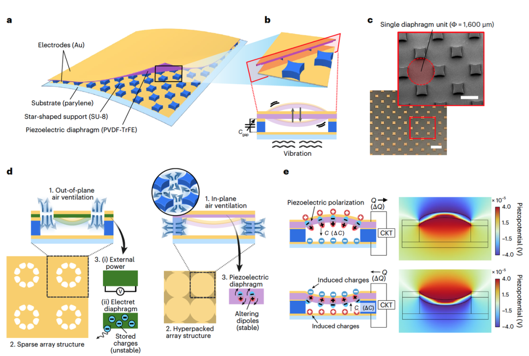 上图展示了超高密度排列的传感器单元如何通过内部空气流通设计和压电调制实现自供电高精度感知。